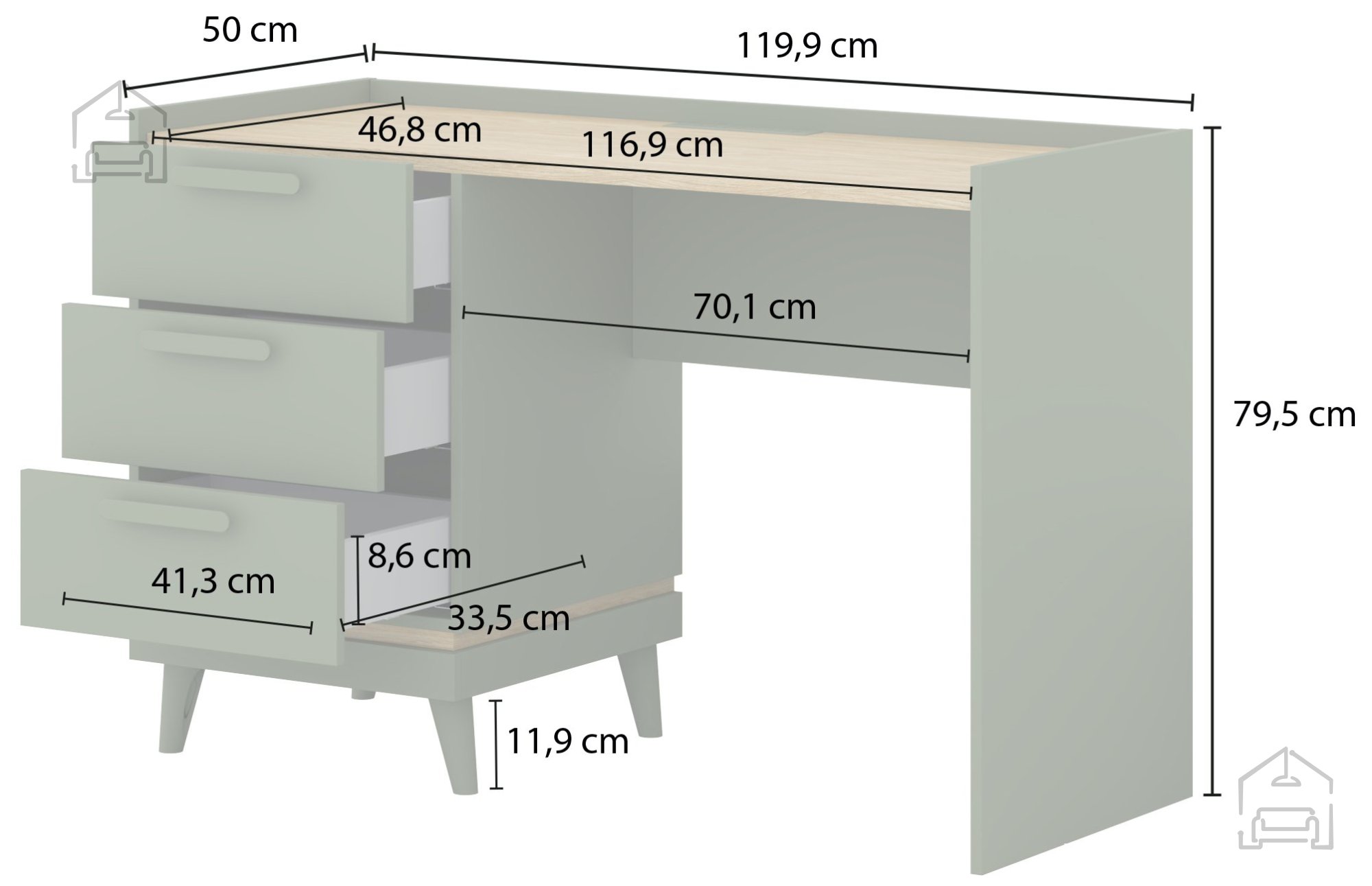 Die Gesamtmaße des Schreibtisches betragen 120 × 50 × 80 cm. Mit einer Tiefe von 50 cm nutzt er den Raum effizient, ohne wuchtig zu wirken. Die Höhe von 80 cm bietet angenehmen Sitzkomfort bei Verwendung eines Standard-Bürostuhls. Die Arbeitsfläche bietet ausreichend Platz für Computer, Unterlagen und Schreibutensilien und bewahrt dennoch die luftige Optik, die für skandinavisches Design typisch ist.