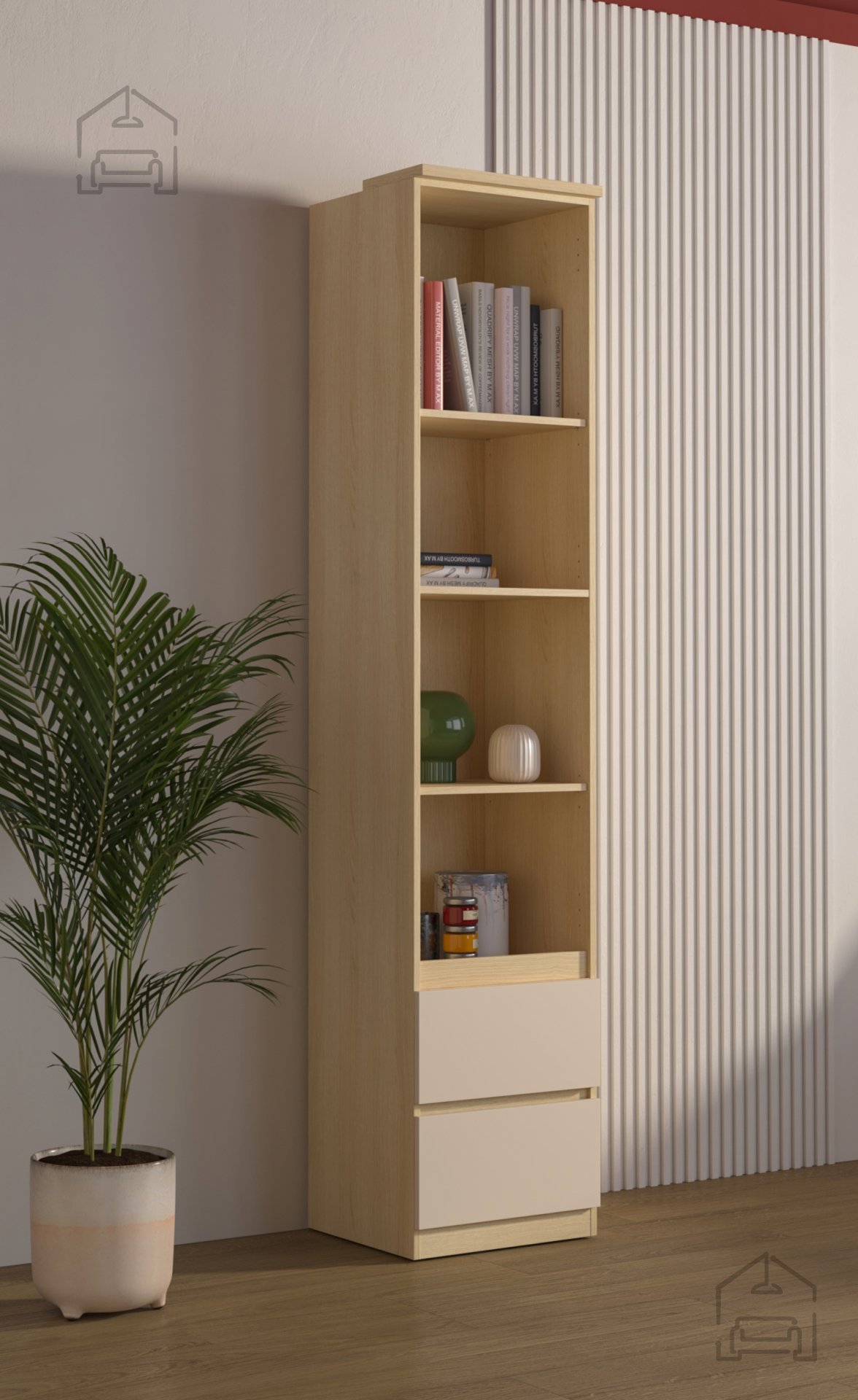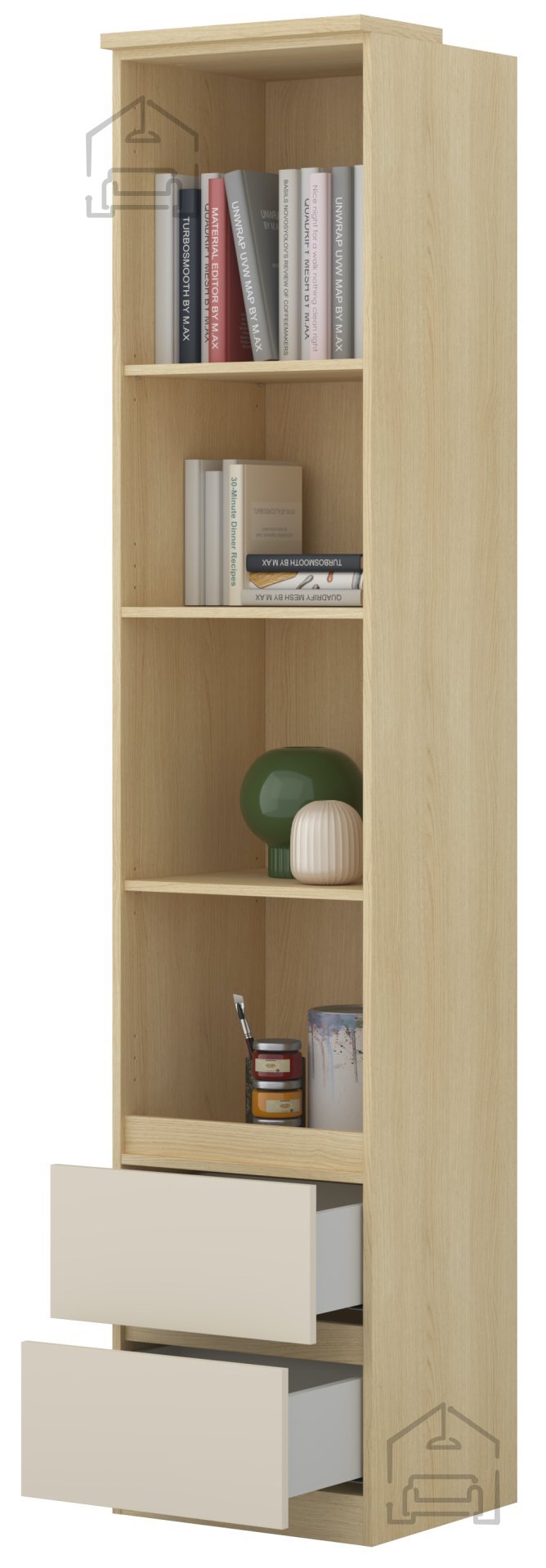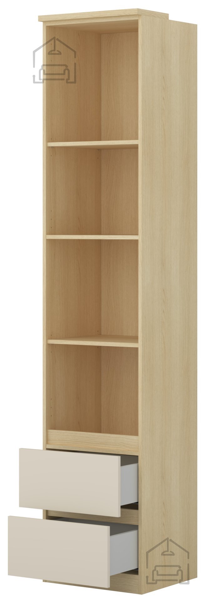 Das Regal Terra – Helvetia Meble ist auf praktische Nutzung im Alltag ausgelegt. Innen bietet es eine Kombination aus offenen Fächern und geschlossenen Schubladen – ideal für Bücher, Deko oder persönliche Gegenstände. Zwei Schubladen im unteren Bereich sorgen für Ordnung und Privatsphäre, während die offenen Ablagen Platz für dekorative Arrangements bieten. Dank der Höhe wird der vertikale Raum optimal genutzt – besonders vorteilhaft in kleineren Wohnungen.