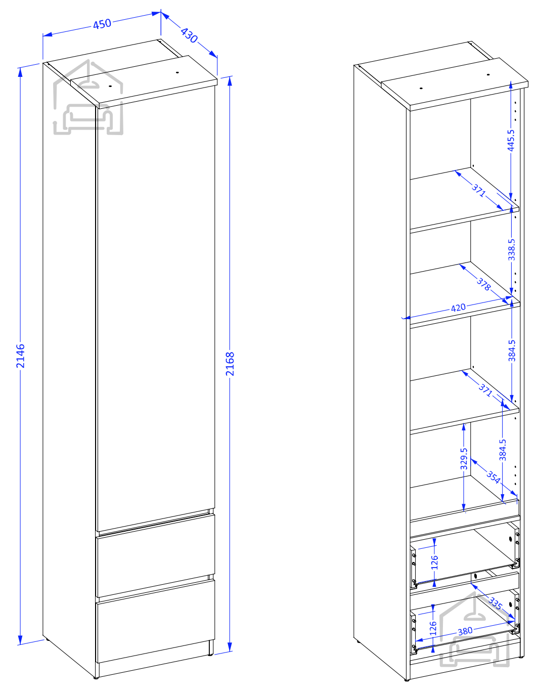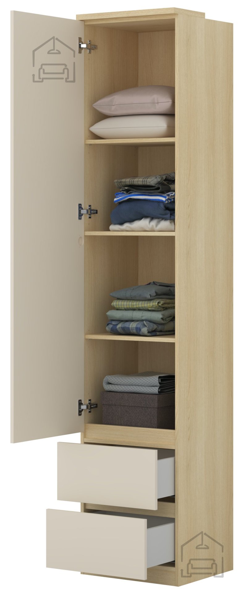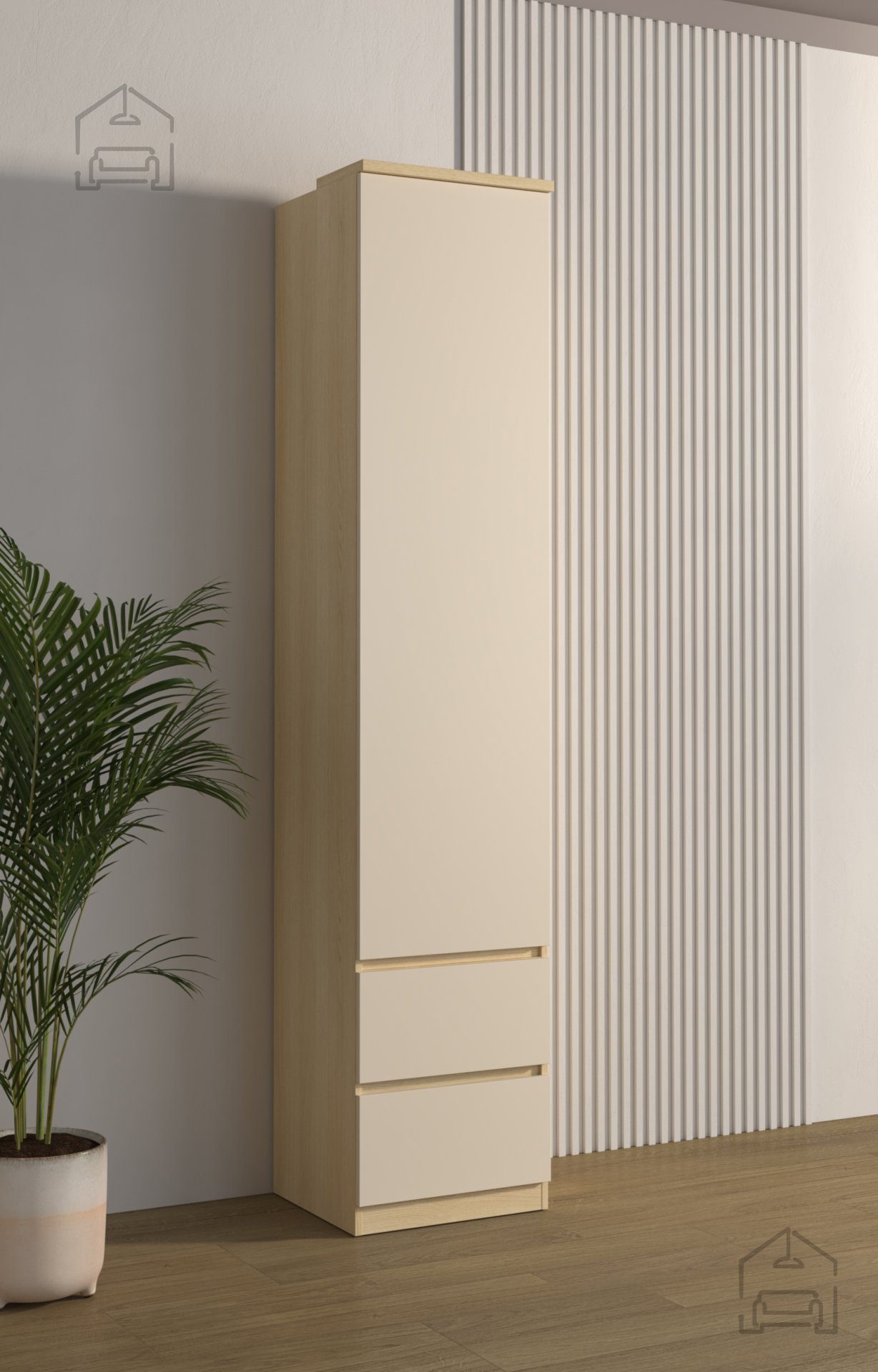 Der Schrank Terra überzeugt mit einer durchdachten Innenaufteilung mit zwei Schubladen und einer Tür. So lassen sich kleinere und größere Gegenstände übersichtlich verstauen. Die Schubladen eignen sich ideal für Dokumente, Accessoires oder kleine Kleidungsstücke, während sich hinter der Tür ausreichend Platz für Bücher, Wäsche oder Alltagsutensilien findet. Mit seiner Höhe von 215 cm bietet der Schrank viel Stauraum, ohne dabei viel Bodenfläche zu beanspruchen.