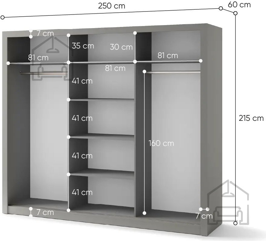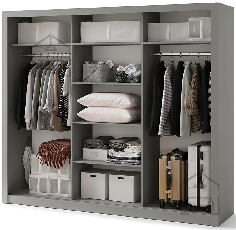 Das Innenleben des Schranks ist so gestaltet, dass Kleidung übersichtlich und praktisch verstaut werden kann. Es umfasst zwei Kleiderstangen sowie ein Innenregal mit mehreren geräumigen Ablageflächen. Auf den oberen Regalbrettern findet sich genügend Platz für saisonale Kleidung, Boxen oder Reisetaschen, während der untere Bereich einen bequemen Zugriff auf täglich genutzte Kleidungsstücke ermöglicht. Die symmetrische Aufteilung erlaubt es, den Stauraum ideal zwischen zwei Personen zu teilen – perfekt für ein gemeinsames Schlafzimmer.