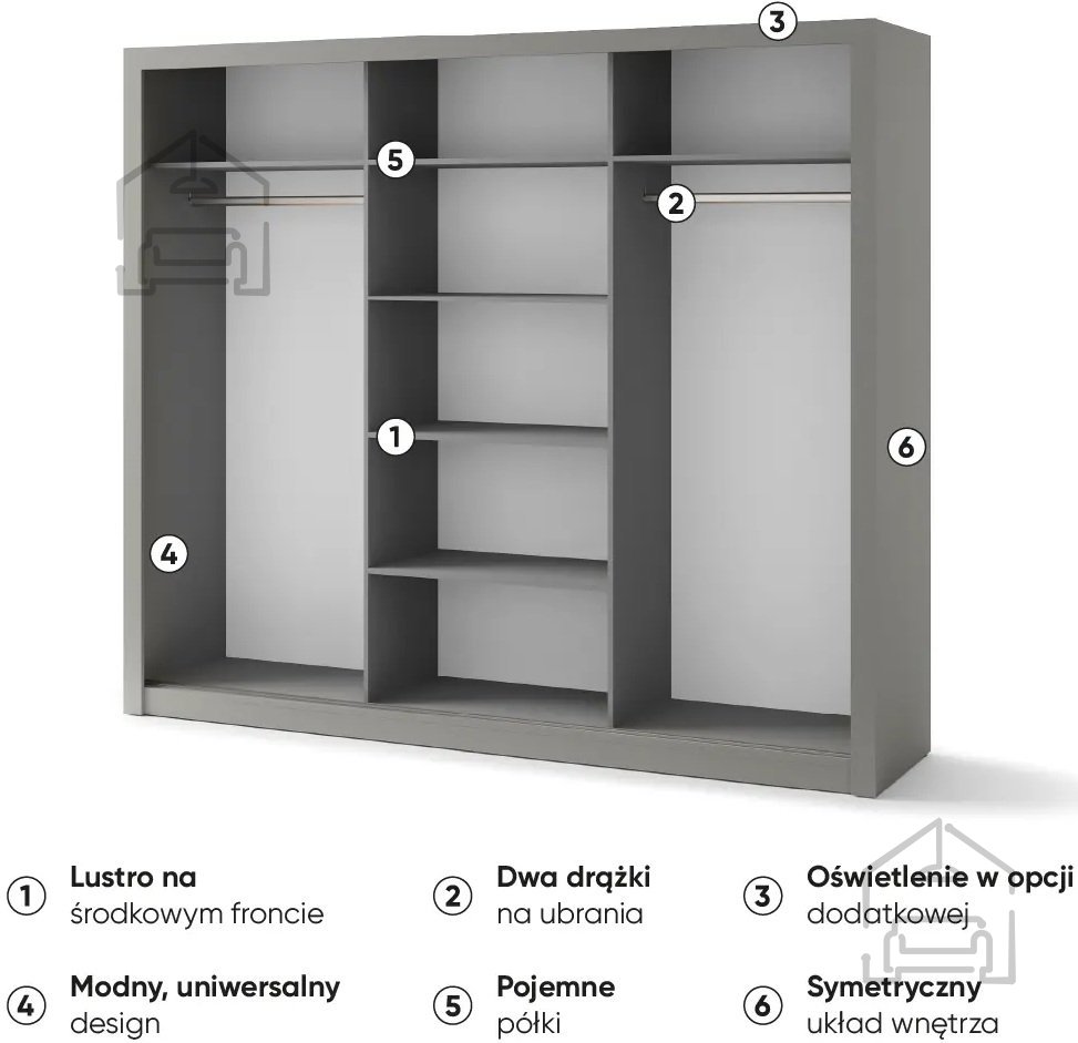 Das Modell Idea ID-01 kann optional mit einer LED-Beleuchtung ergänzt werden, die gegen Aufpreis erhältlich ist. Die energiesparenden doppelten LED-Leuchten (LED-2S) erhellen das Schrankinnere und erleichtern das Finden von Kleidung auch am Abend. Gleichzeitig sorgt das Licht für eine elegante, moderne Atmosphäre und hebt das Möbelstück optisch hervor.