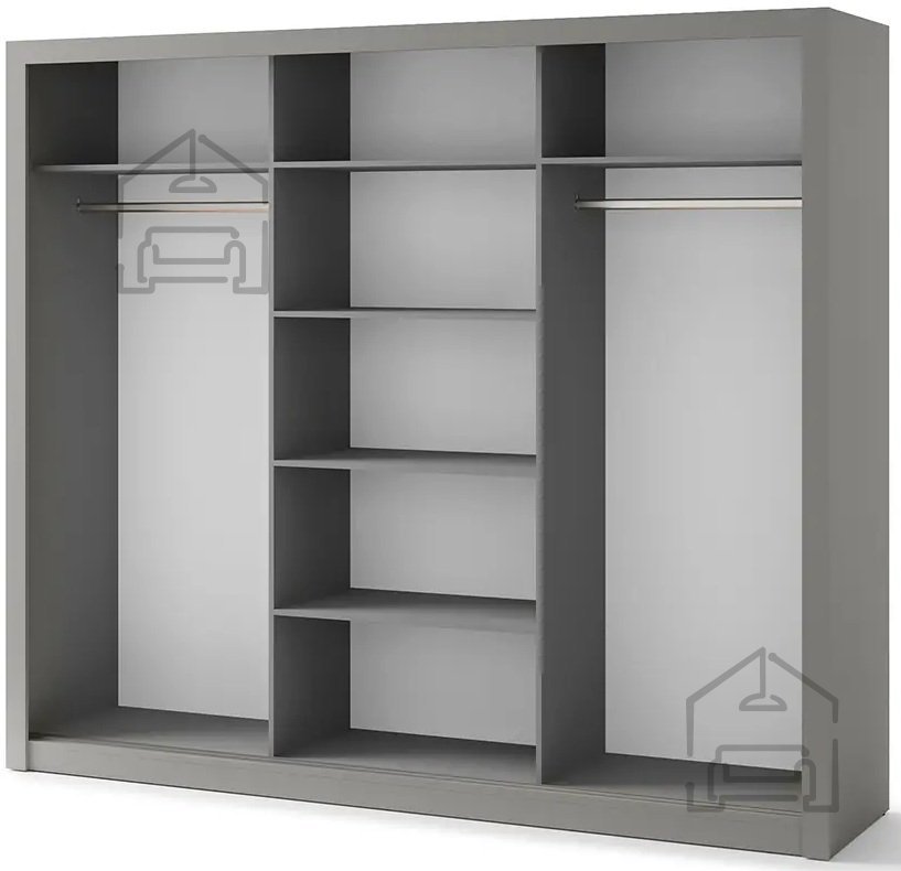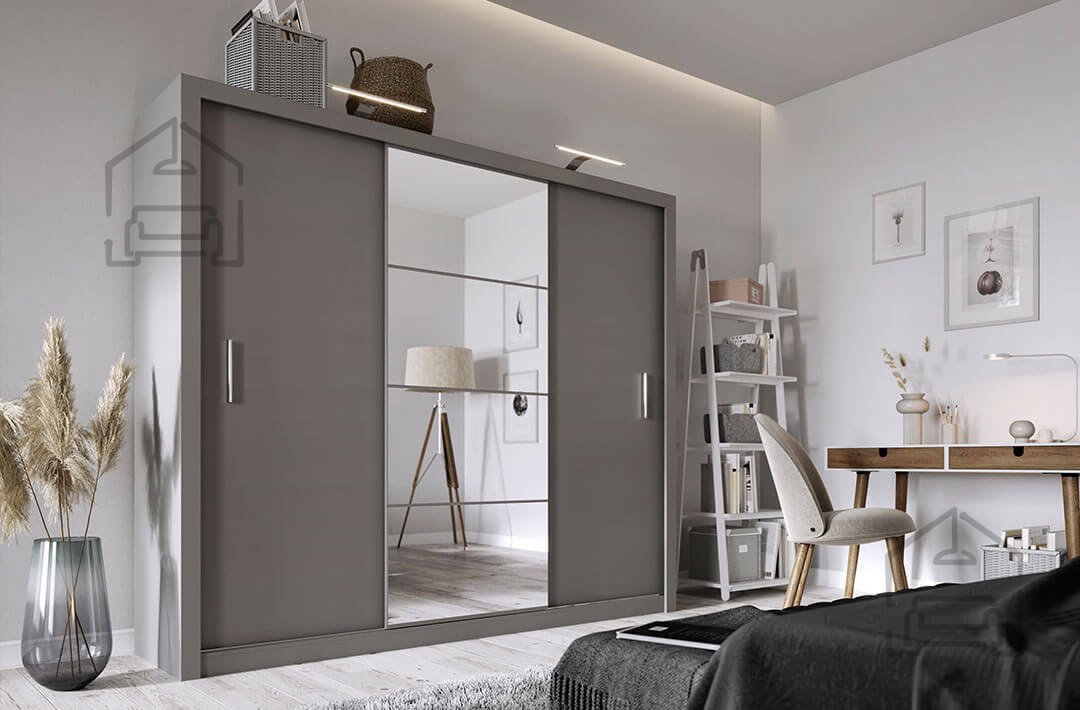 Im Mittelpunkt des Schranks befindet sich ein großes Spiegelpaneel, das gleich zwei Vorteile bietet: Es lässt den Raum optisch größer und heller erscheinen und erleichtert zugleich die tägliche Kleiderwahl. Dieses Detail unterstreicht das moderne Design und bringt zugleich praktischen Nutzen. Der graue Farbton verleiht dem Raum einen frischen, aufgeräumten Charakter und lässt sich wunderbar mit verschiedenen Wandfarben und Textilien kombinieren.
