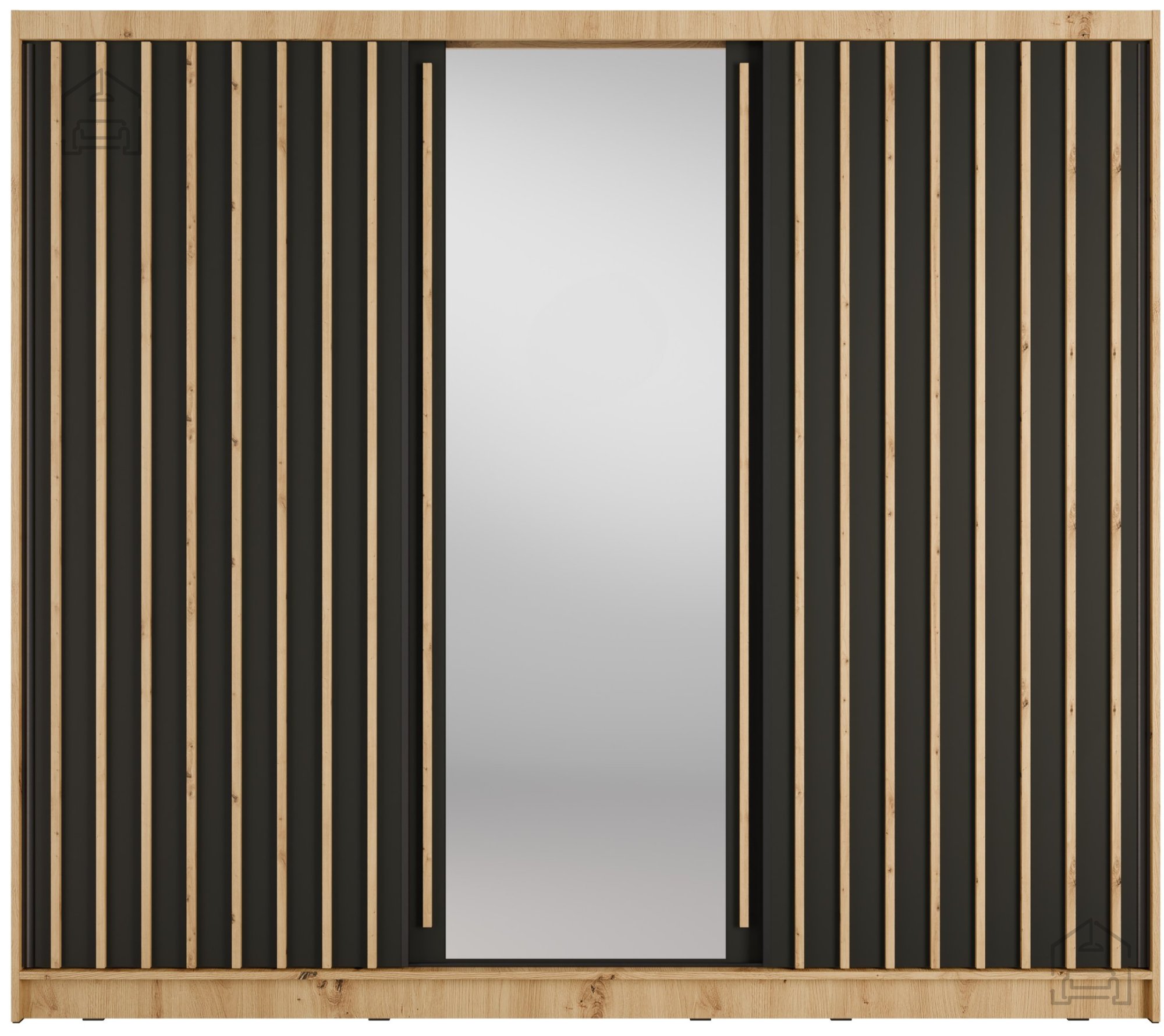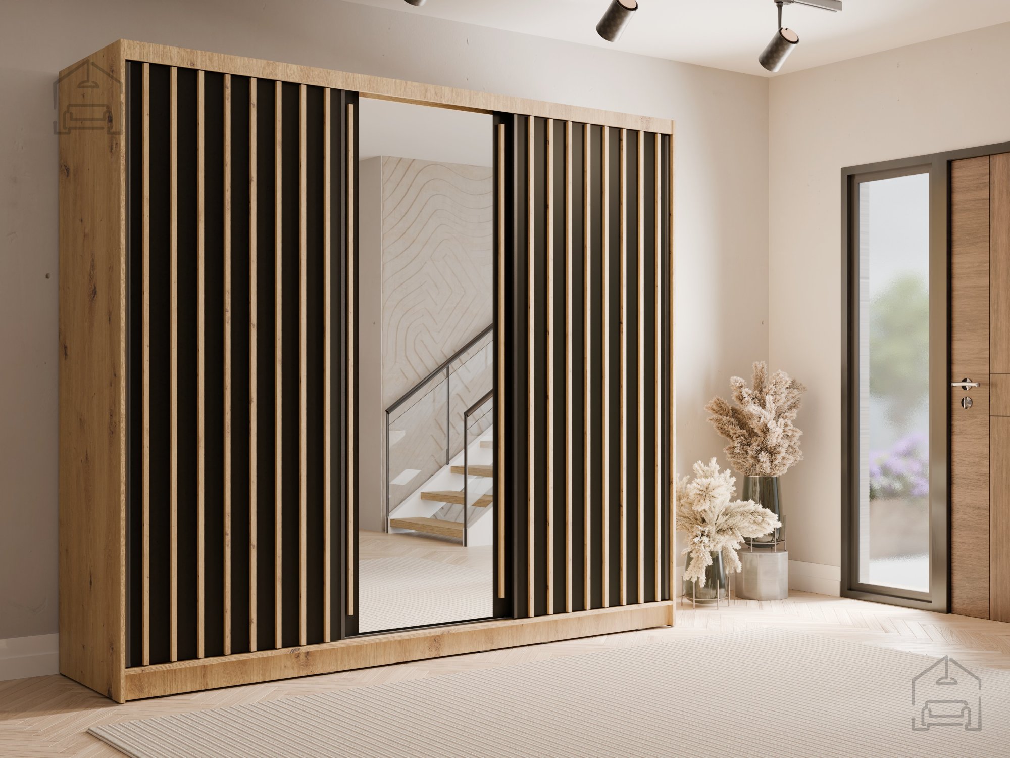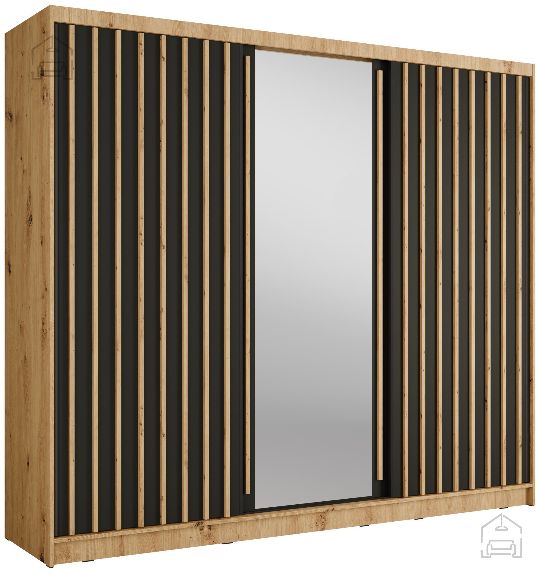 Die Farbkombination aus Eiche Artisan und schwarzen Akzenten verleiht dem Schrank eine moderne, aber zugleich warme Wirkung. Die Eiche imitiert mit ihrer realistischen Maserung die natürliche Holzstruktur und schafft ein behagliches Ambiente, während die schwarzen Elemente für Kontrast und optische Tiefe sorgen. Diese Farbgestaltung lässt sich mühelos mit unterschiedlichsten Wandfarben, Bodenbelägen und Möbelstücken kombinieren. Ob im Wohnzimmer, Schlafzimmer oder Vorraum – der Schrank fügt sich harmonisch in minimalistische und industrielle Einrichtungsstile ein und wirkt dabei sowohl stilvoll als auch praktisch.