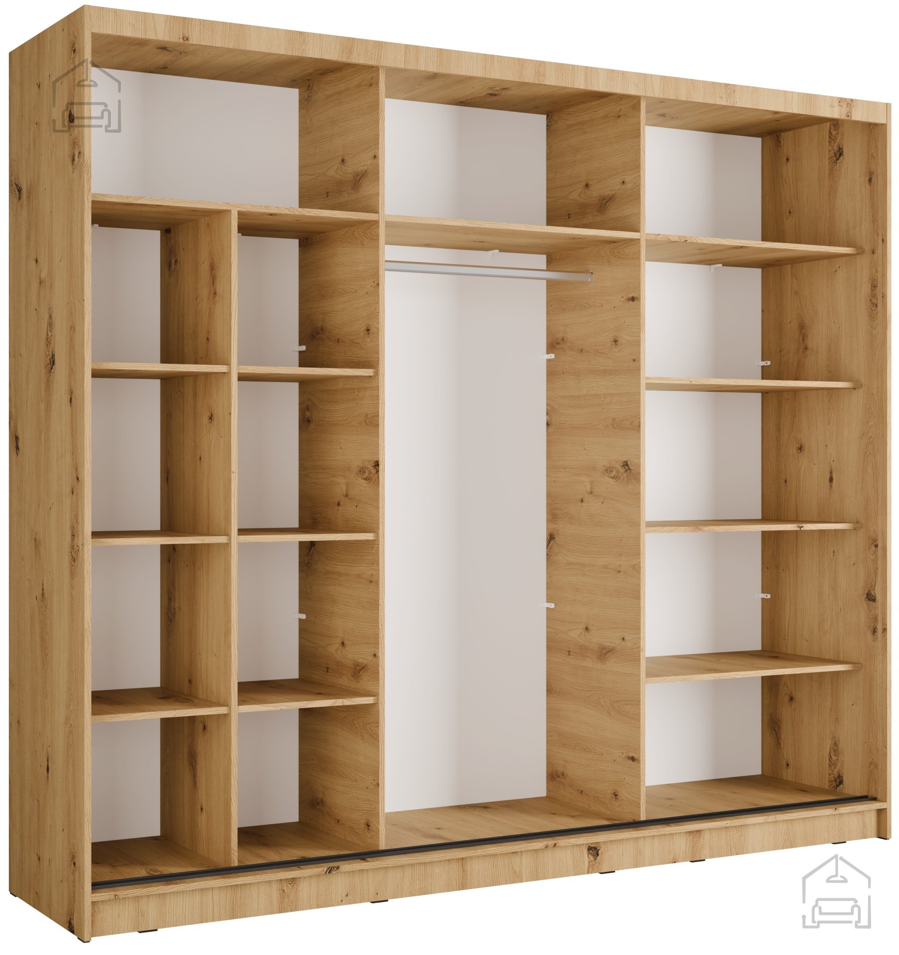 Der Kleiderschrank mit Schiebetüren Aluna 13 in der Farbe Eiche Artisan vereint die natürliche Holzoptik mit moderner Funktionalität. Hergestellt wird er in der polnischen Fabrik Meblosiek, die für ihre hochwertige Verarbeitung von Holzplatten und präzise Möbelherstellung bekannt ist. Mit einer Breite von 248 cm, einer Tiefe von 62 cm und einer Höhe von 215 cm bietet der Schrank großzügigen Stauraum für Kleidung, Schuhe und Accessoires und behält dabei eine elegante Ausstrahlung – sowohl im Schlafzimmer als auch im Vorraum. Die Oberfläche aus laminierter Platte ist kratzfest und pflegeleicht, wodurch der Schrank ideal für den täglichen Gebrauch in Familienhaushalten oder kleineren Wohnungen geeignet ist.