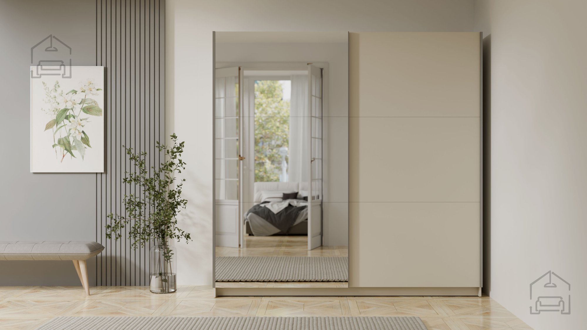 Die Hauptfarbe des Schranks ist sand beige – ein warmer, neutraler Ton, der sich harmonisch mit vielen Boden- und Wandfarben kombinieren lässt. Auf Wunsch kann er mit weiteren Elementen im Dekor Eiche Artisan ergänzt werden, was einen angenehmen natürlichen Kontrast schafft. Klare Linien und glatte Flächen unterstreichen den modernen Stil, während die Aluminiumgriffe einen eleganten metallischen Akzent setzen.
