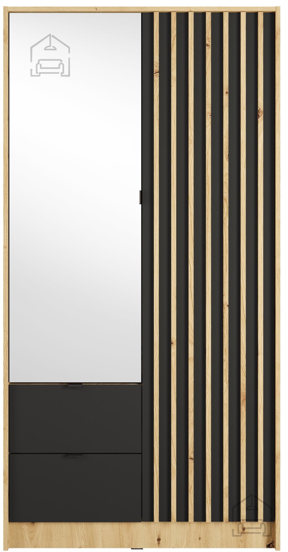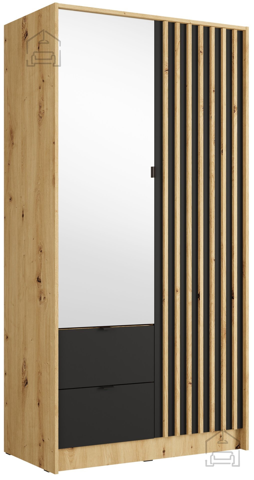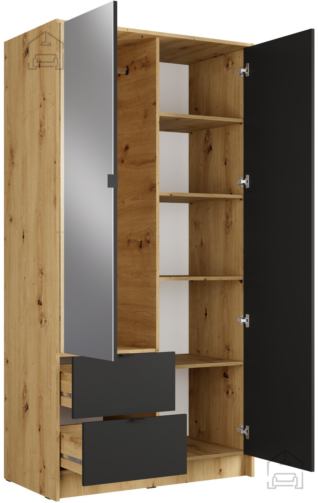 Der Kleiderschrank Katania 15 der Marke Meblosiek ist ein elegantes Möbelstück, das Funktionalität, modernes Design und hochwertige Verarbeitung vereint. Gefertigt aus einer 16 mm starken laminierten Platte, überzeugt er durch Stabilität und Langlebigkeit. Die Oberfläche in warmer Eiche-Artisan-Optik kombiniert mit schwarzen Details wirkt modern und zugleich wohnlich – perfekt geeignet für verschiedenste Einrichtungsstile, von klassisch bis industriell.