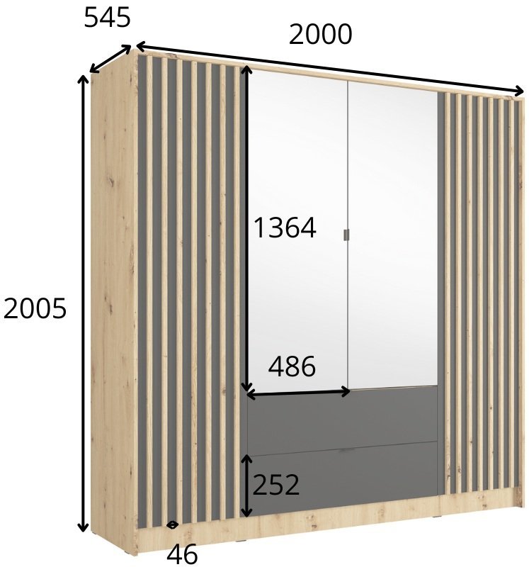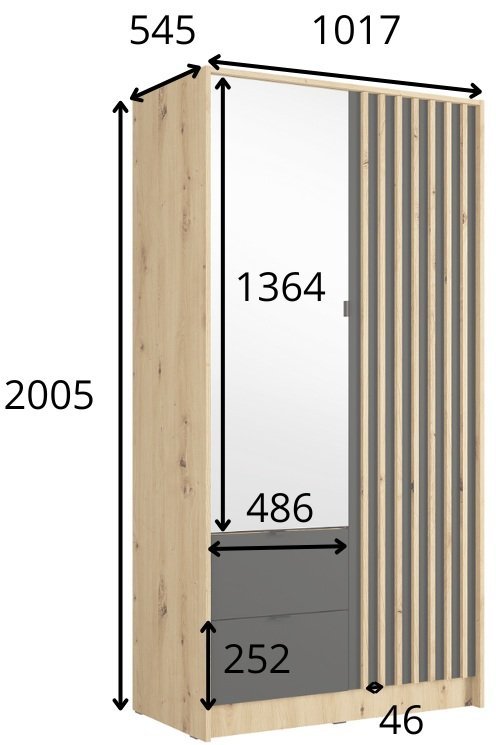 Mit den Abmessungen von 101,7×54,5×200,5 cm bietet der Schrank ausreichend Platz für Kleidung, Schuhe und Accessoires. Der Innenraum ist in mehrere Fächer unterteilt – insgesamt 8 – und ermöglicht so eine übersichtliche Organisation der Garderobe. Dank der durchdachten Anordnung bleibt jedes Kleidungsstück leicht erreichbar, was die tägliche Nutzung erleichtert und für Ordnung im Schlafzimmer, Vorraum oder Ankleidezimmer sorgt.