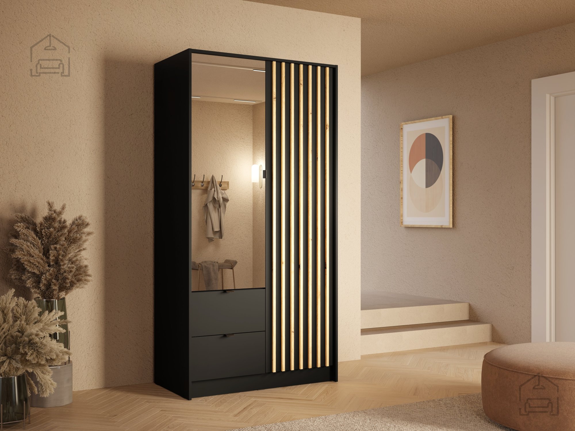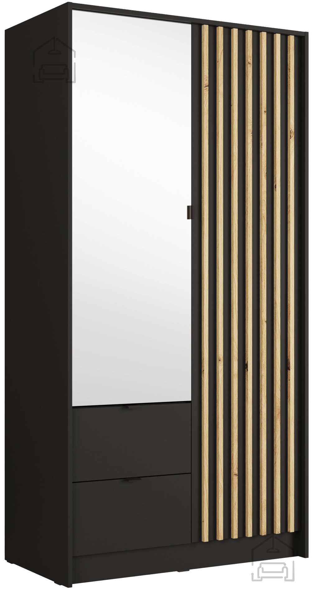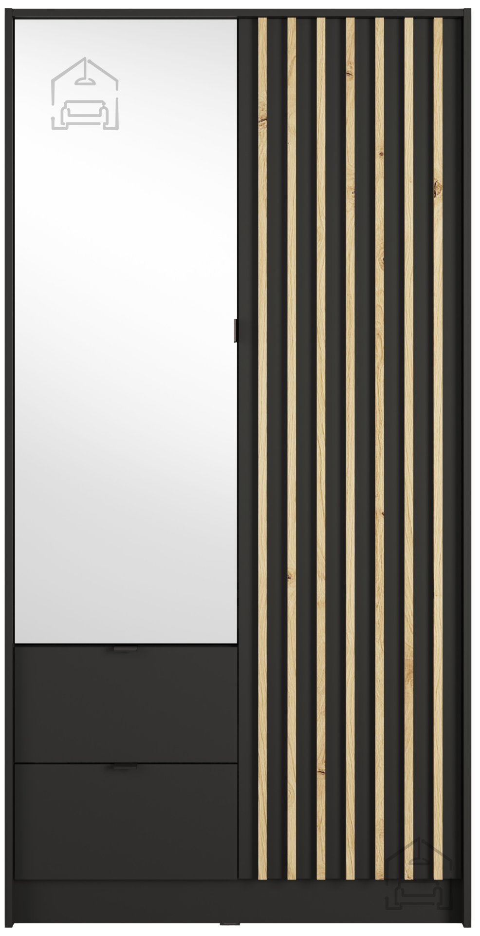 Der Schrank Katania 15 überzeugt mit klaren Linien und einer harmonischen Verbindung von natürlicher Holzoptik und kontrastierenden schwarzen Akzenten. Die Metallgriffe dienen nicht nur dem bequemen Öffnen der Türen, sondern verleihen dem Möbelstück auch einen modernen Touch. Das Zusammenspiel der Materialien und Farben sorgt für einen angenehmen optischen Eindruck und ein Gefühl von Ordnung und Wärme im Raum.