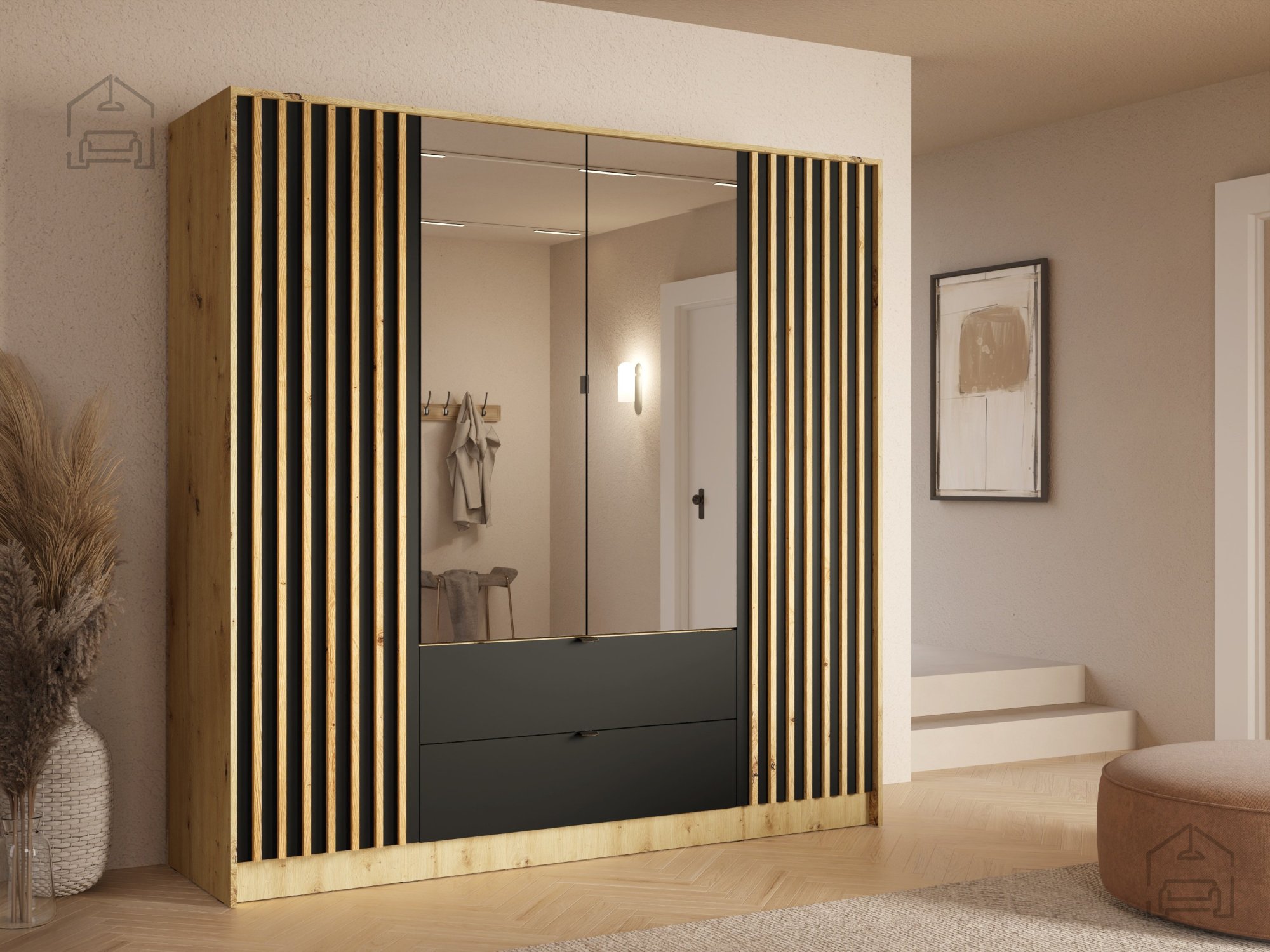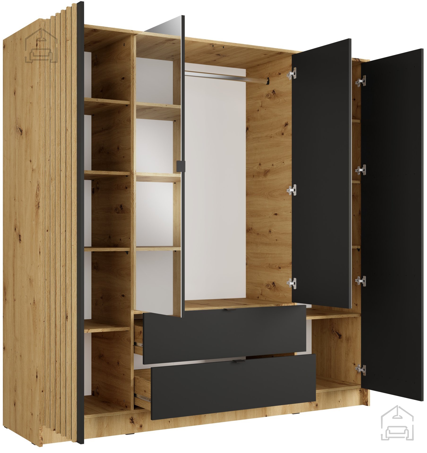 Der Kleiderschrank Katania 20 der Marke Meblosiek ist ein elegantes Möbelstück, das Funktionalität, modernes Design und hochwertige Verarbeitung vereint. Gefertigt aus einer 16 mm starken laminierten Platte bietet er Stabilität und Langlebigkeit. Die Oberfläche in warmem Eichenholzton Artisan kombiniert mit schwarzen Details wirkt modern und zugleich wohnlich – perfekt für unterschiedlichste Einrichtungsstile, von klassisch bis industriell.