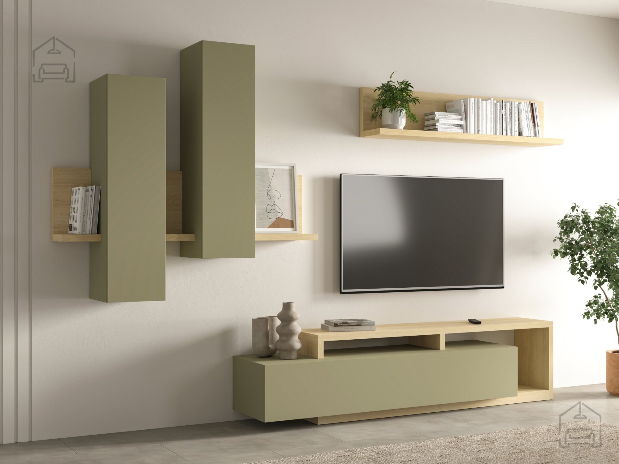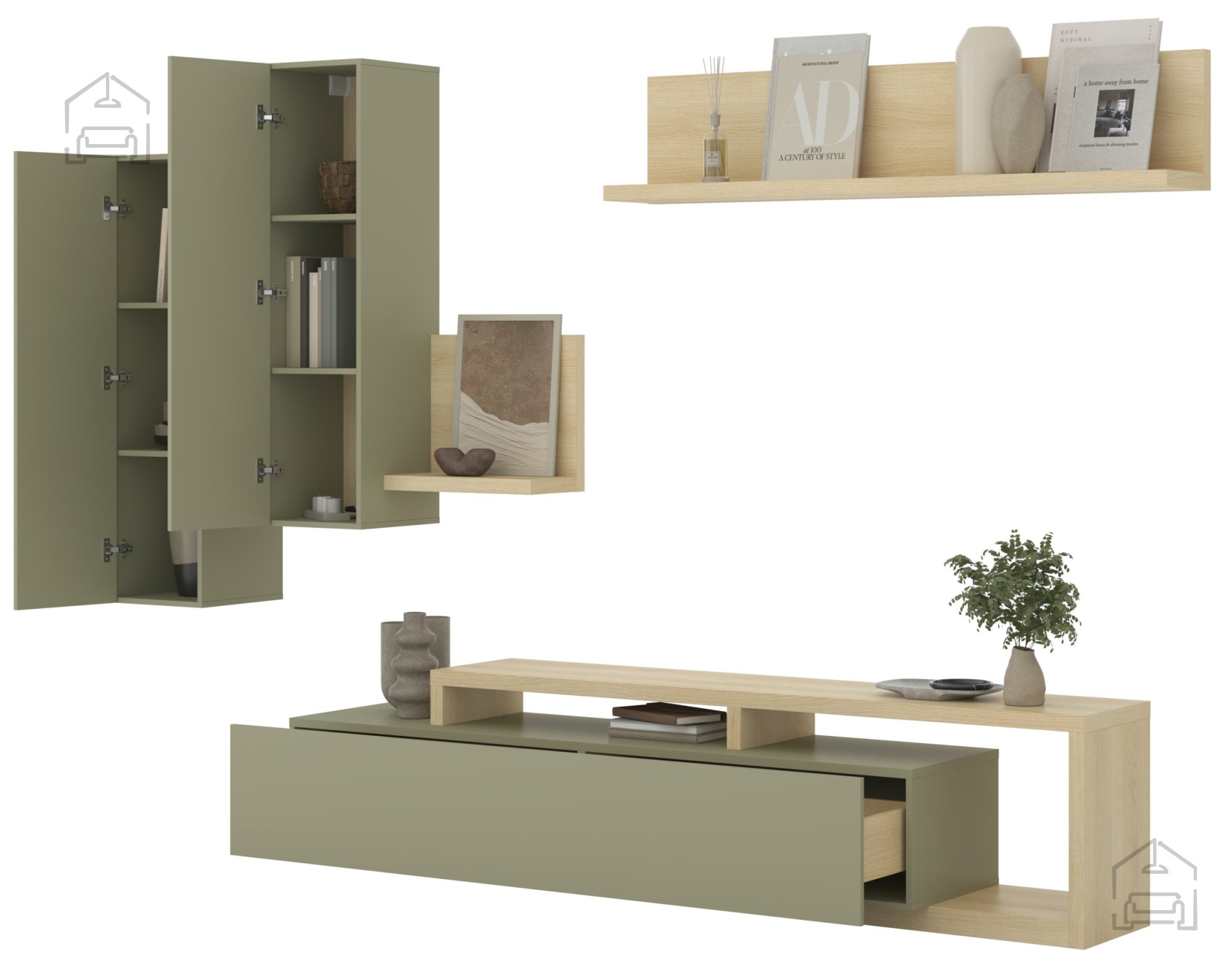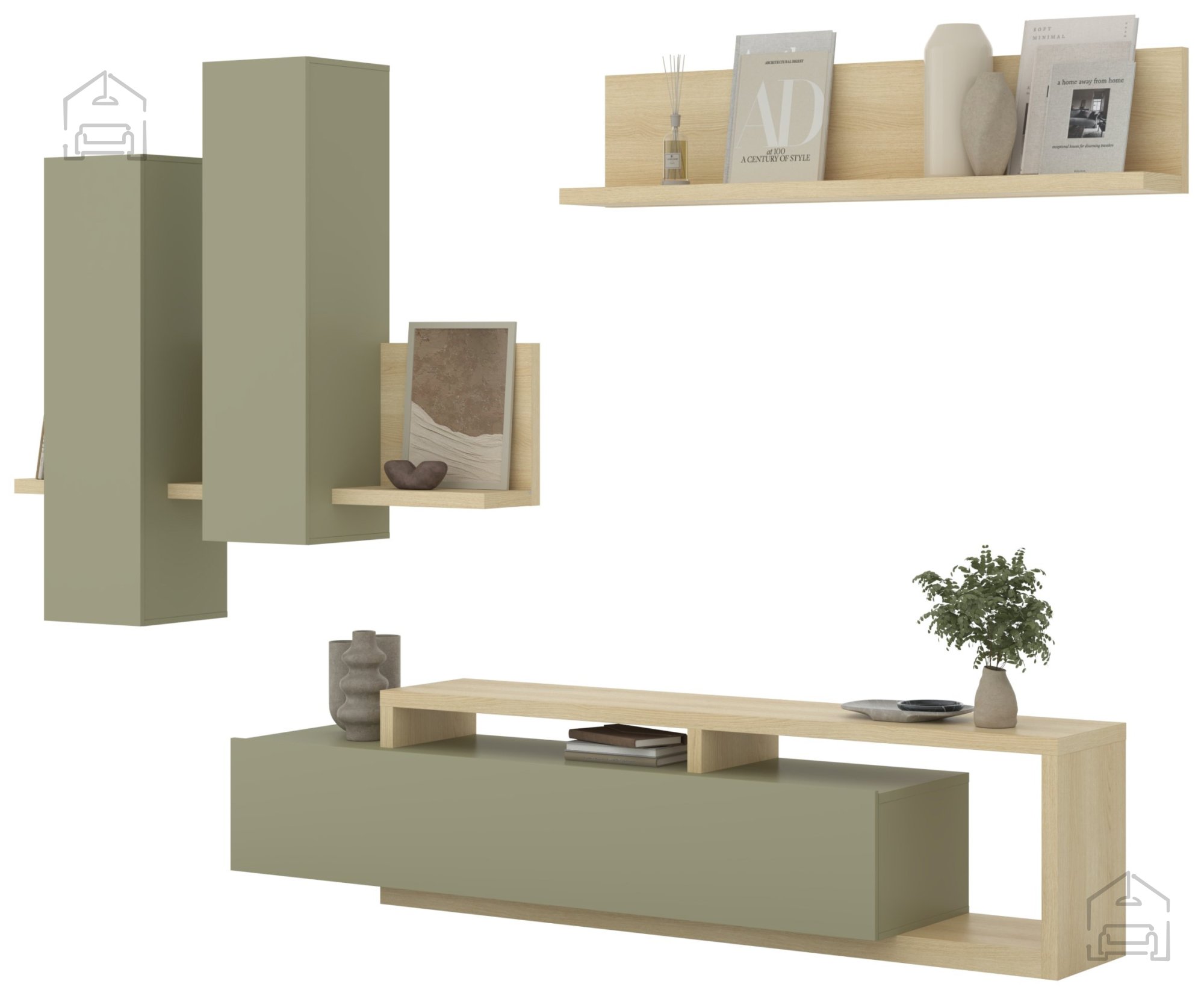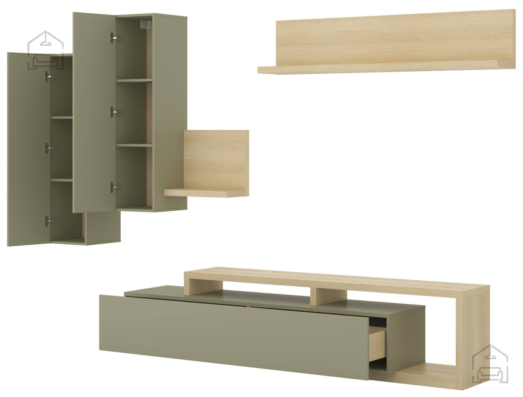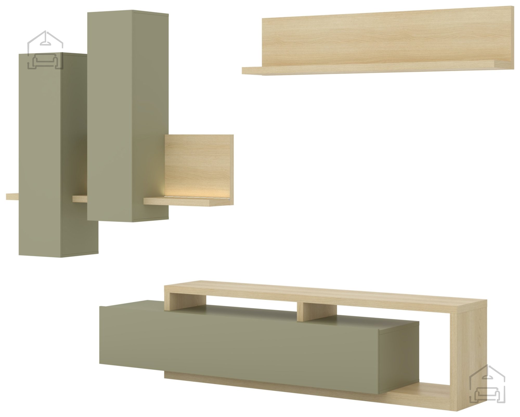 Das Wohnzimmer-Set Bota – Helvetia meble vereint modernes Design mit der natürlichen Ausstrahlung von Holz. Die Kollektion aus hochwertigem MDF ist für alle gedacht, die sich ein Ambiente wünschen, das Komfort und optische Harmonie verbindet. Die Kombination aus Eichen- und Eukalyptusfarben sorgt für einen angenehmen Kontrast, der zu vielen Einrichtungsstilen passt – von minimalistisch bis klassisch. Dieses Möbelset schafft Ordnung im Wohnzimmer und bietet eine funktionale wie auch ästhetische Lösung zum Aufbewahren und Präsentieren von Gegenständen.