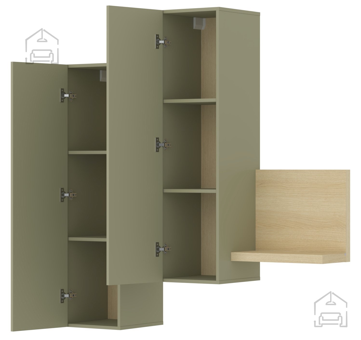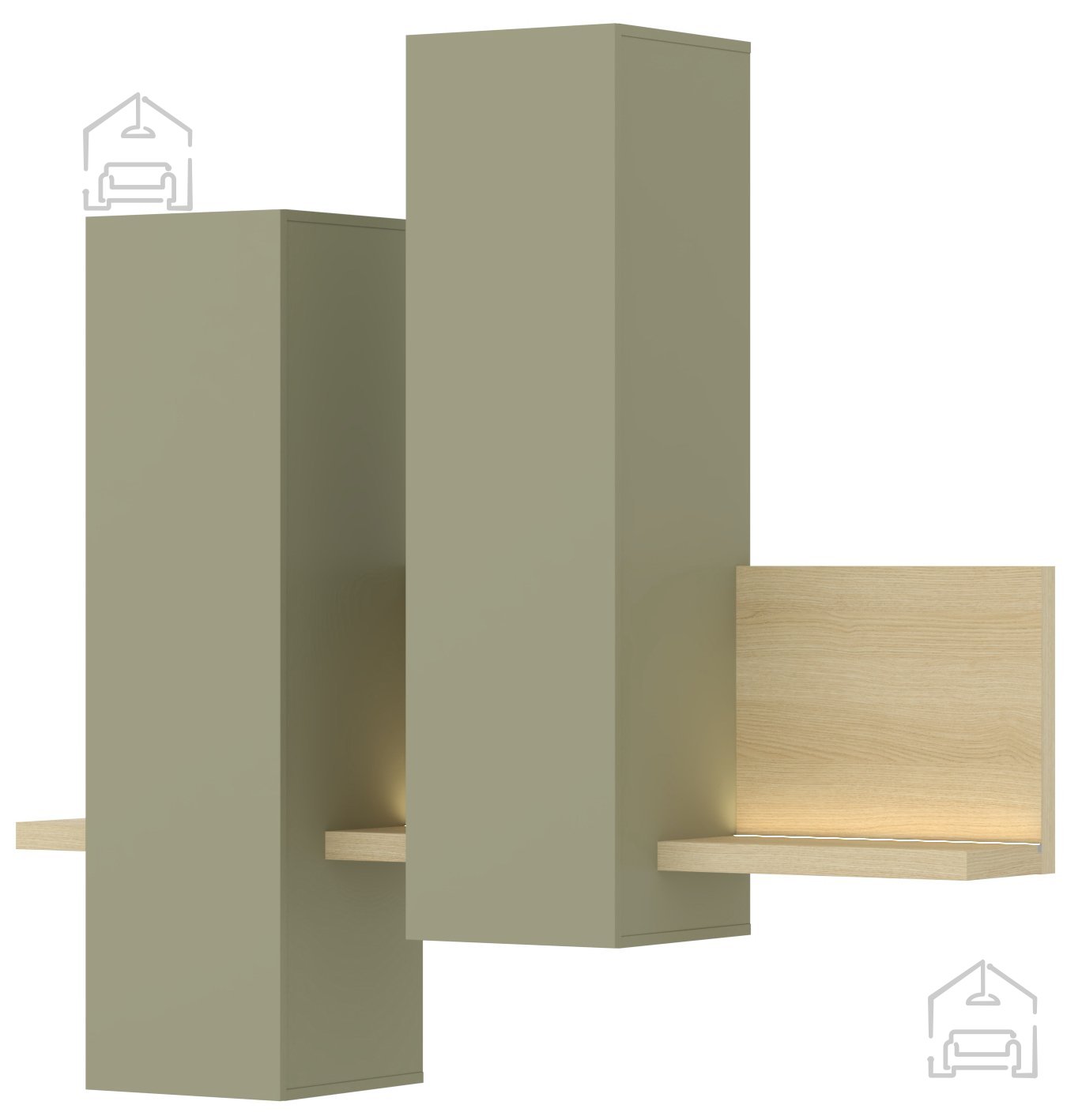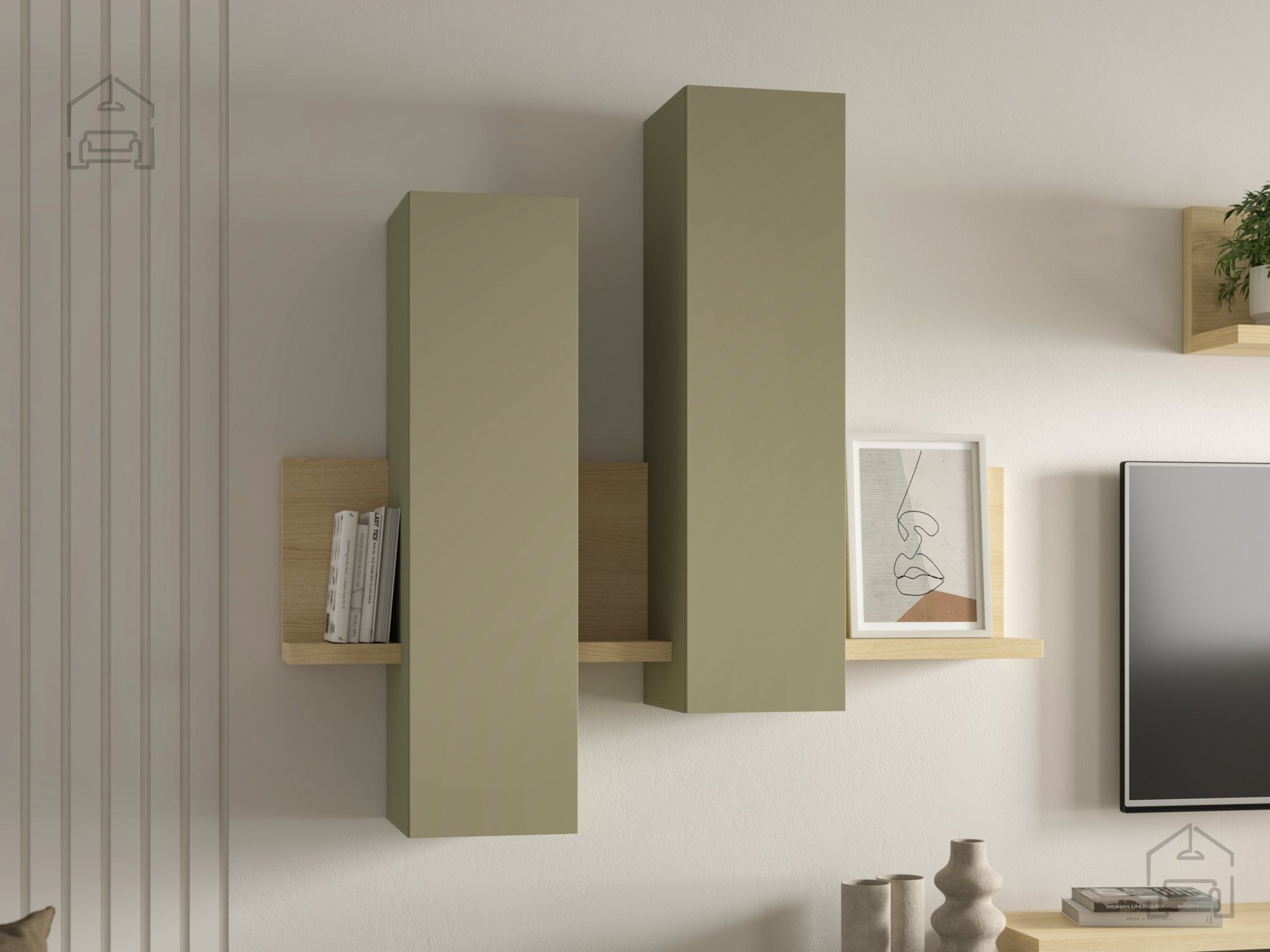 Der Schrank Bota lässt sich hervorragend mit anderen Möbelstücken aus derselben Kollektion kombinieren. Die Serie ist so gestaltet, dass mehrere Elemente flexibel zusammengestellt werden können. Kombinieren Sie ihn beispielsweise mit Lowboards, Kommoden oder Regalen in den gleichen Farbtönen, um ein harmonisches Gesamtbild zu schaffen. Durch sein ruhiges Design passt er sowohl in minimalistische als auch in natürlich gestaltete Wohnräume. Das Eichenholz bringt Wärme, der Eukalyptus-Ton Frische – gemeinsam sorgen sie für ein ausgewogenes, modernes Ambiente.