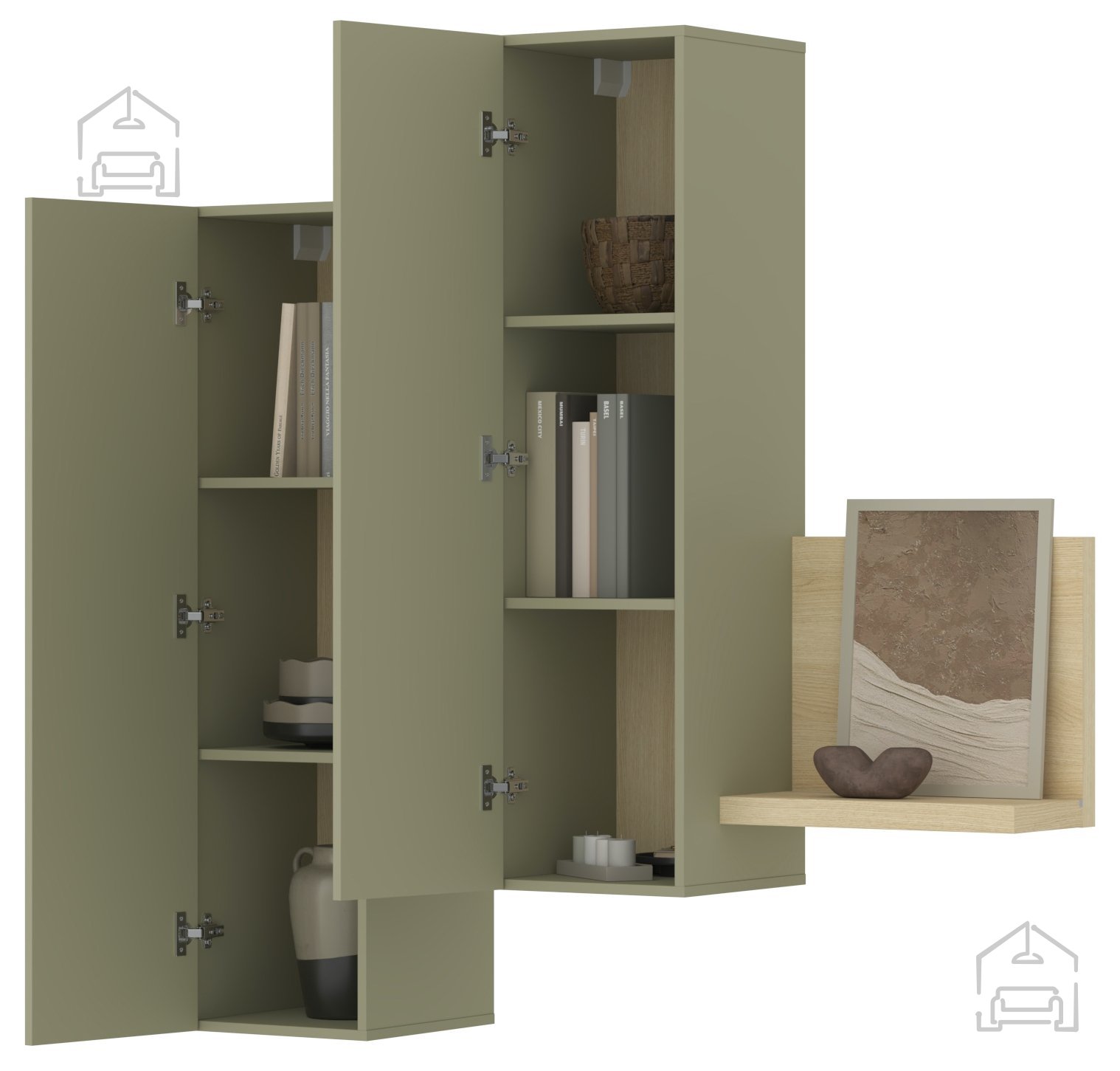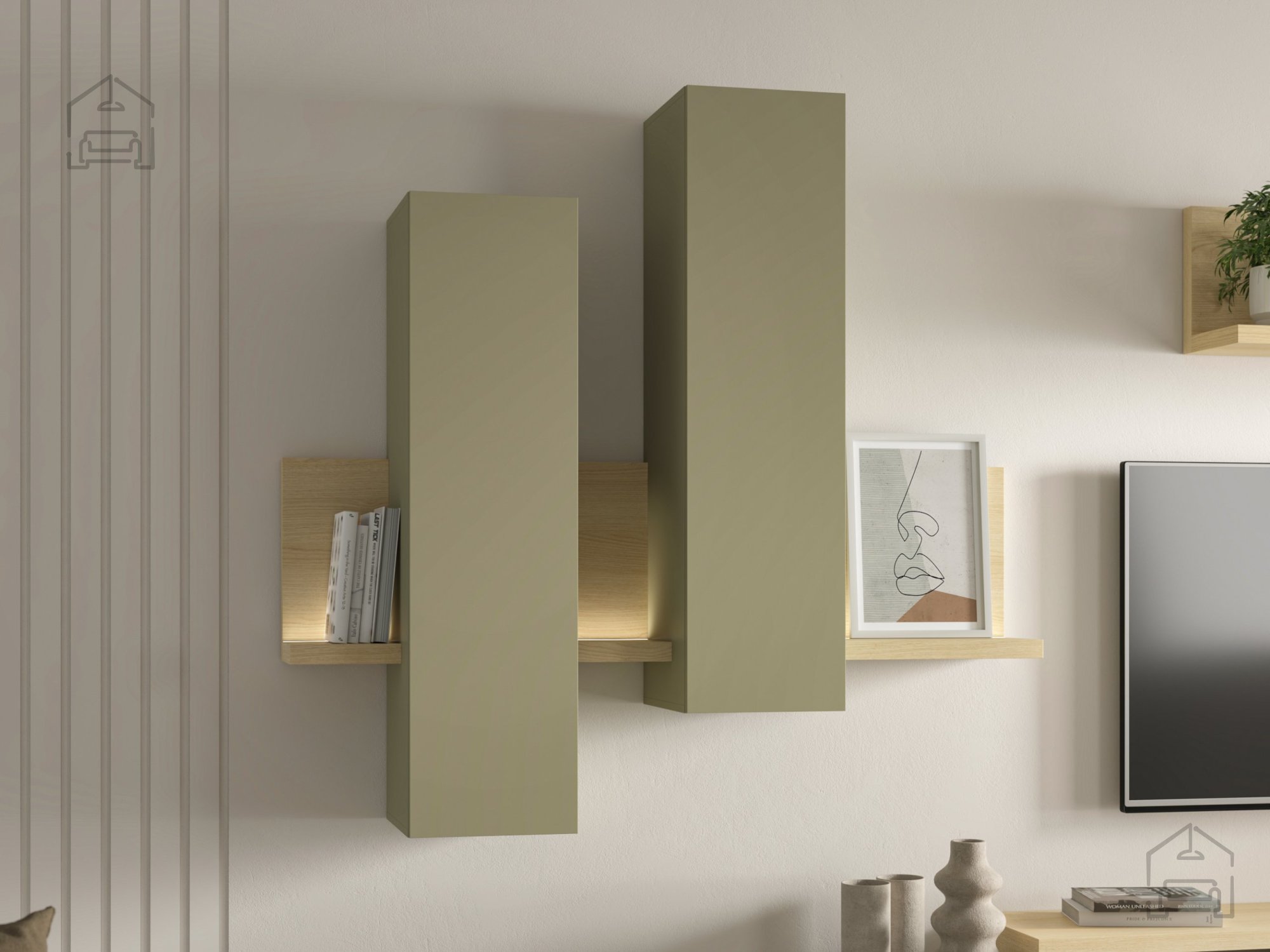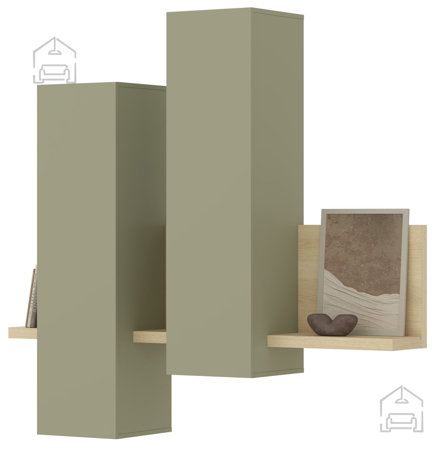 Der Schrank Bota lässt sich hervorragend mit anderen Möbelstücken aus derselben Kollektion kombinieren. Die Serie ist so gestaltet, dass mehrere Elemente flexibel zusammengestellt werden können. Kombinieren Sie ihn beispielsweise mit Lowboards, Kommoden oder Regalen in den gleichen Farbtönen, um ein harmonisches Gesamtbild zu schaffen. Durch sein ruhiges Design passt er sowohl in minimalistische als auch in natürlich gestaltete Wohnräume. Das Eichenholz bringt Wärme, der Eukalyptus-Ton Frische – gemeinsam sorgen sie für ein ausgewogenes, modernes Ambiente.
