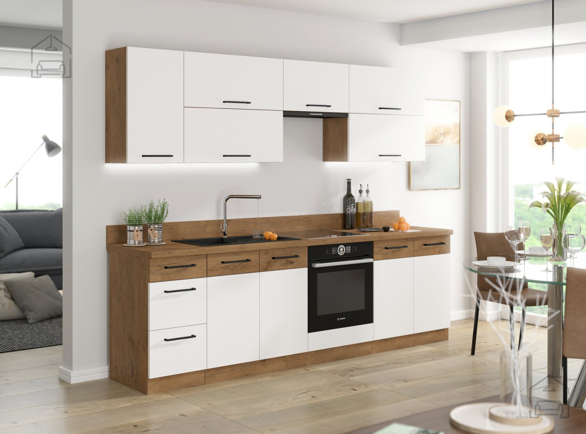 Die Küche Vigo HG ist eine Kombination aus modernem Design und Funktionalität. In dieser Serie bieten wir Ihnen 45 Arten von Elementen an, mit denen Sie die Küche Ihrer Träume gestalten können. Die weiße Küchenmöblierung Vigo HG ist ein universeller Vorschlag für geschlossene und offene Küchen. Der Korpus besteht aus laminiertem Plattenmaterial in der Farbe Eiche Lancelot, und die Fronten aus hochglänzendem weißem MDF sind zusätzlich mit einer Folie geschützt, die hitzebeständig ist (ABS). Elemente und Schubladen sind mit dem Indamatic-System für sanftes Schließen ausgestattet. Die Kollektion für Küchen Vigo ist die perfekte Lösung für alle, die Komfort und individuellen Stil schätzen.